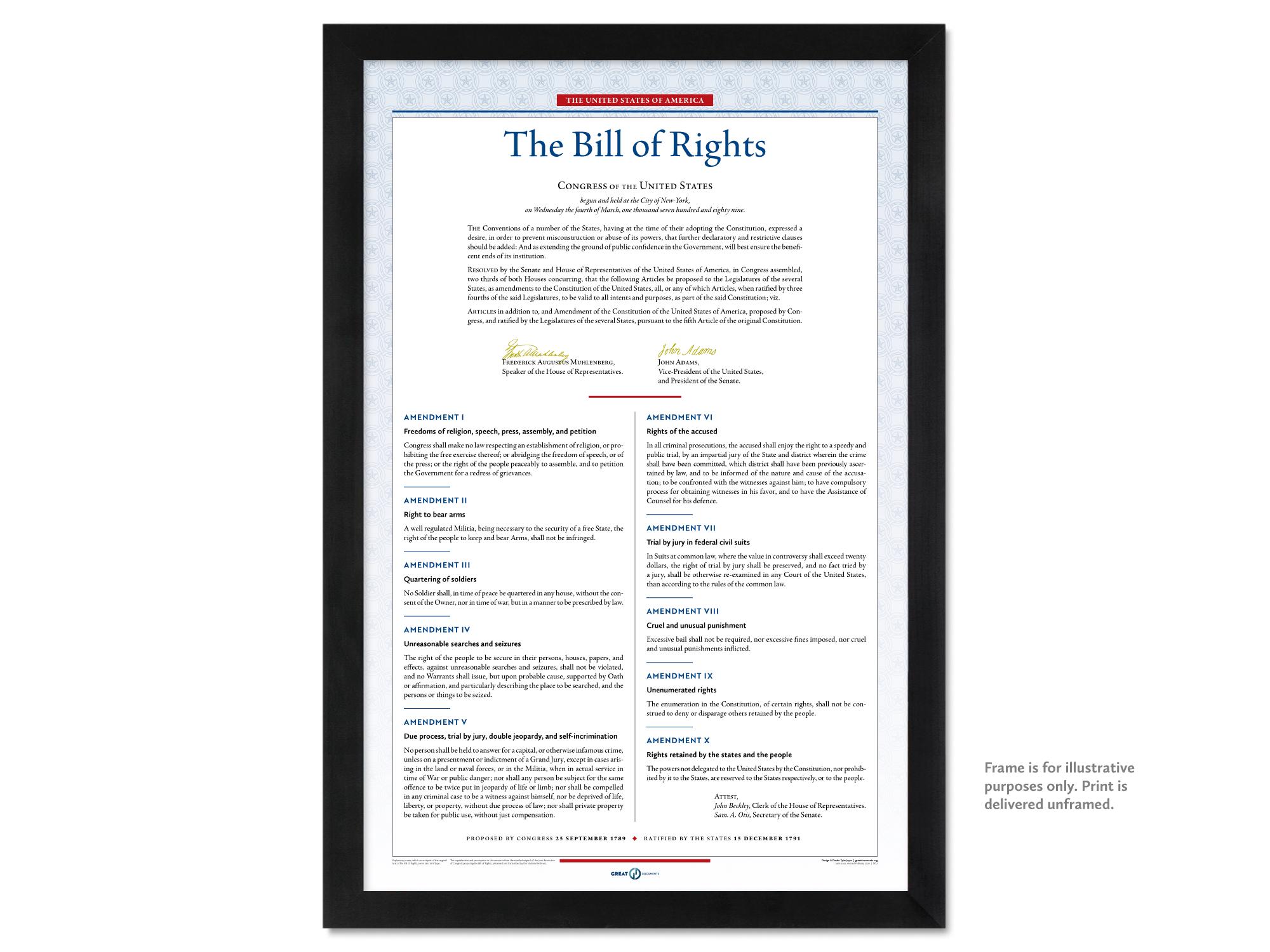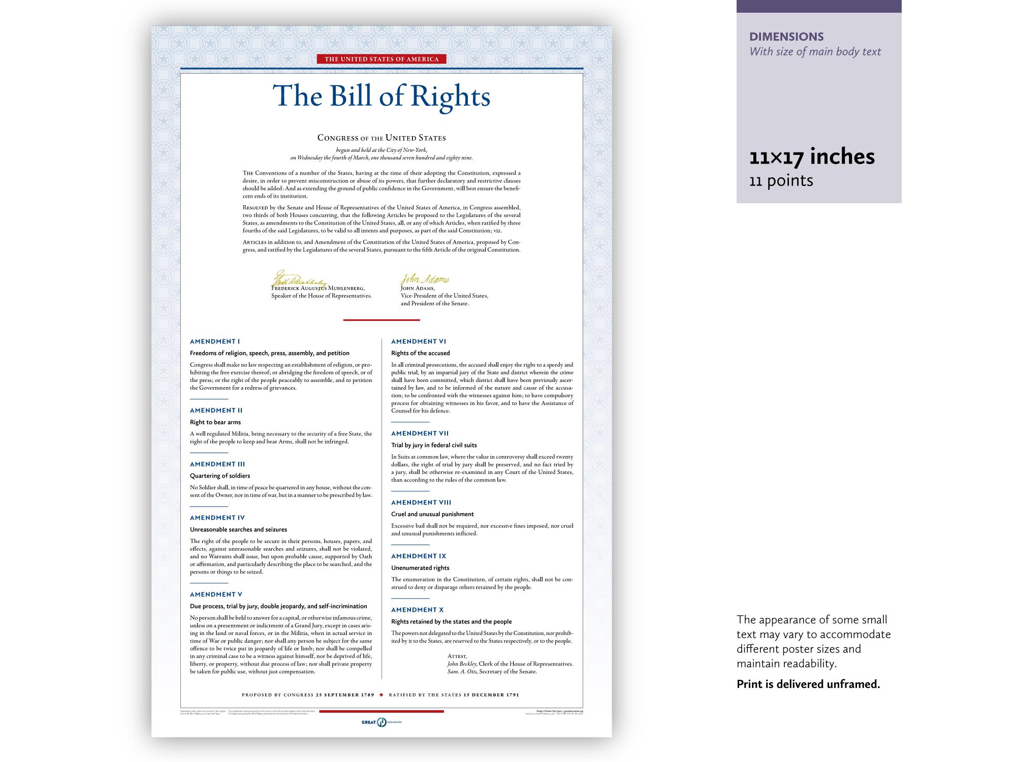 Celebrate America’s rich heritage of freedom with this display-worthy print of the Bill of Rights, perfect for display at home, in the office, or in the classroom.