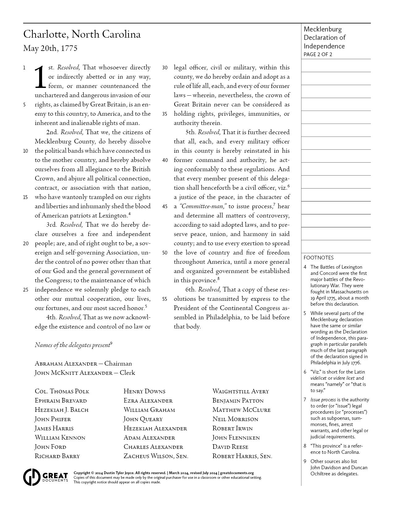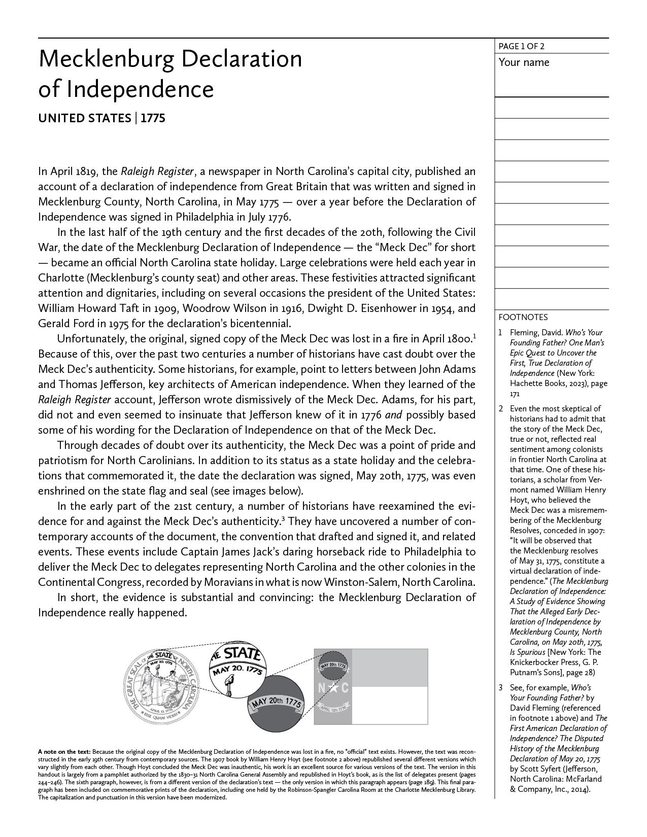 Mecklenburg Declaration of Independence (United States | 1775) — Digital download — Classroom handout