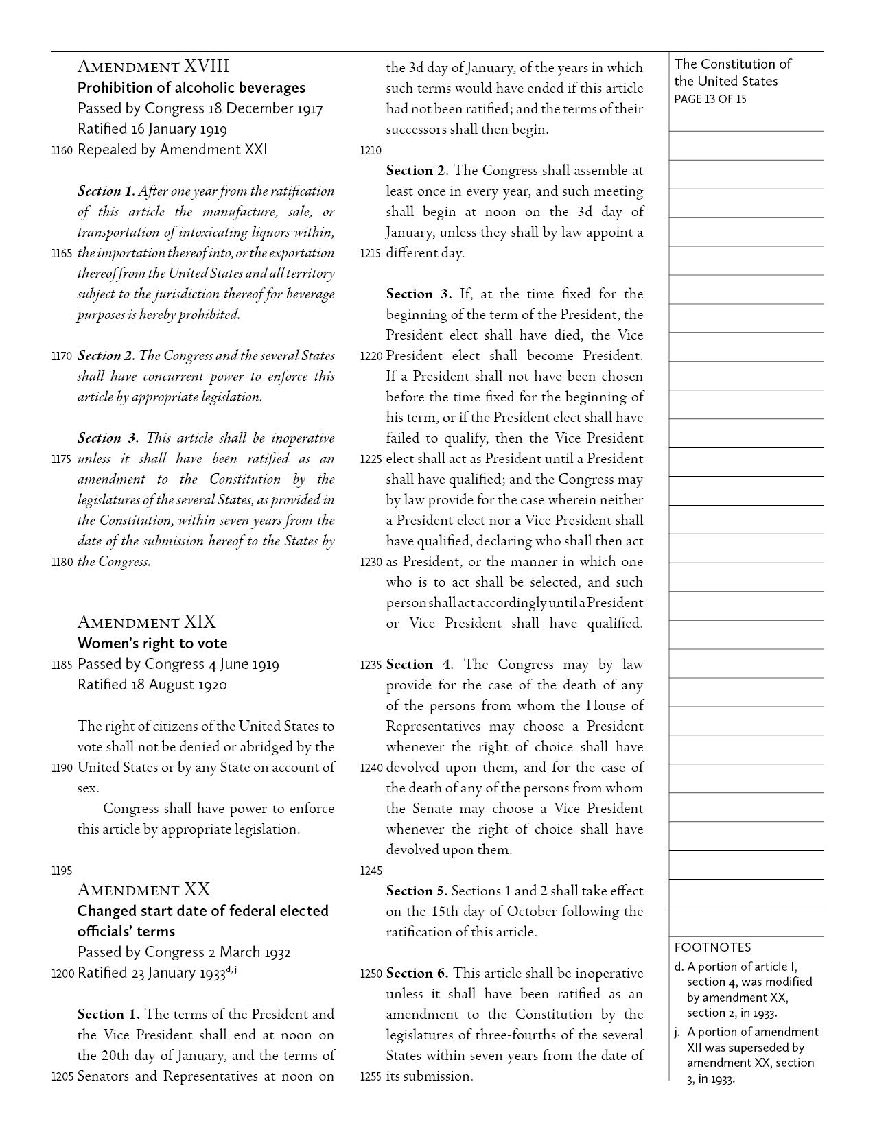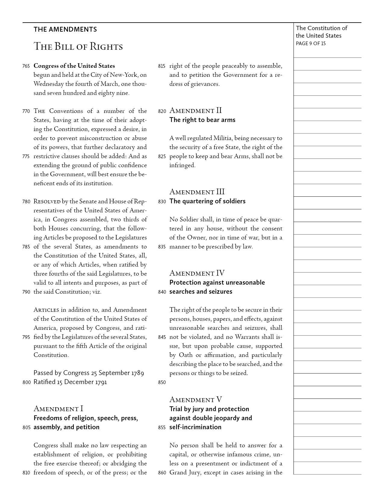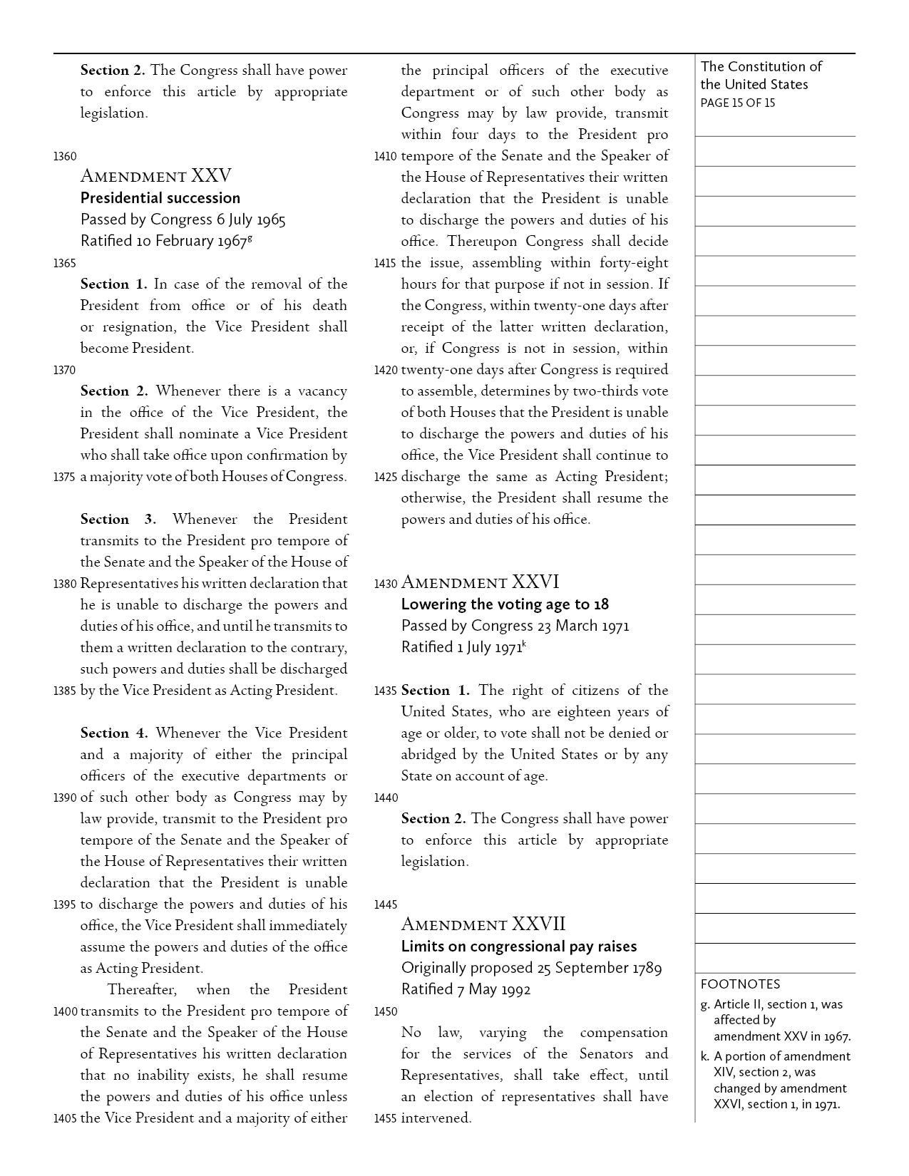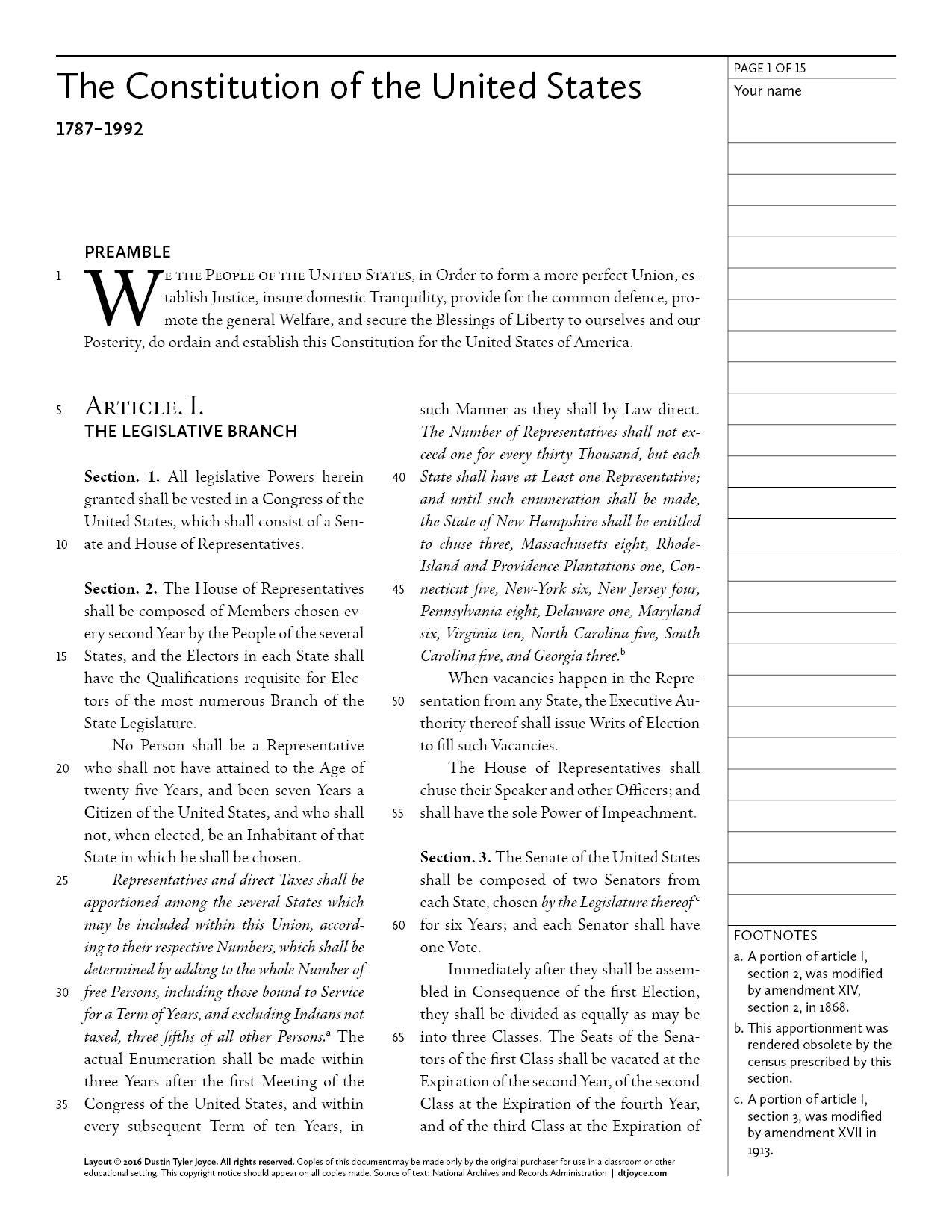 The complete, official text of the Constitution of the United States, including all 27 amendments (the 10 amendments that comprise the Bill of Rights plus the 17 other amendments). The document is divided into two sections so teachers can use which portion they need: the original nine articles, including the names of the signers, are in the first eight pages, so teachers can produce copies of just the original text if they choose; the amendments, including the Bill of Rights, are in the remaining seven pages if the complete document is to be read or studied.