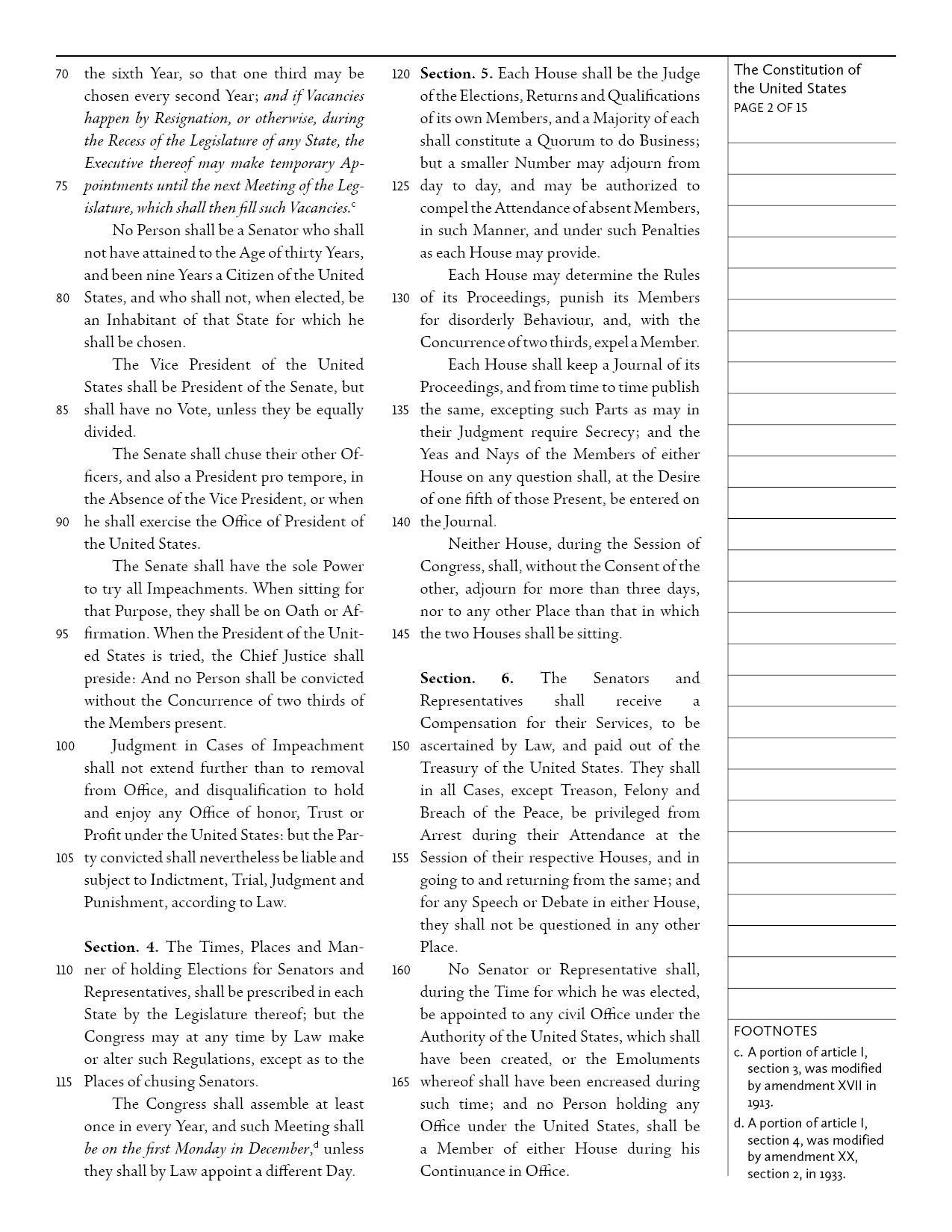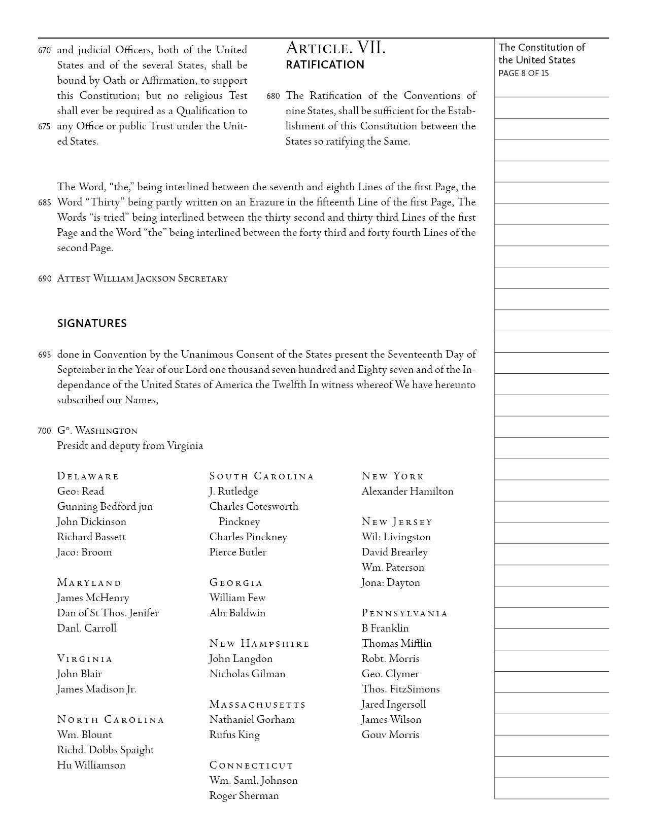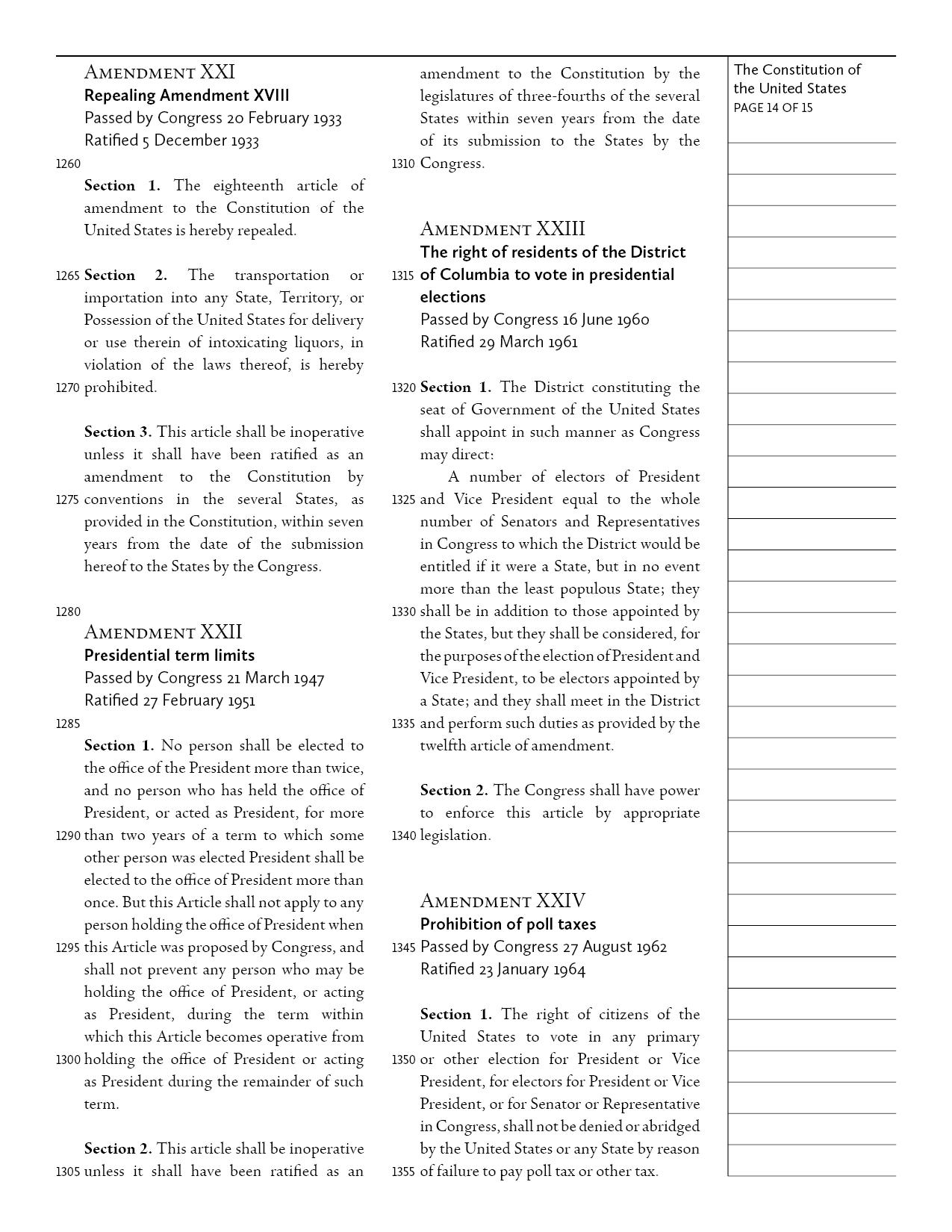 The complete, official text of the Constitution of the United States, including all 27 amendments (the 10 amendments that comprise the Bill of Rights plus the 17 other amendments). The document is divided into two sections so teachers can use which portion they need: the original nine articles, including the names of the signers, are in the first eight pages, so teachers can produce copies of just the original text if they choose; the amendments, including the Bill of Rights, are in the remaining seven pages if the complete document is to be read or studied.