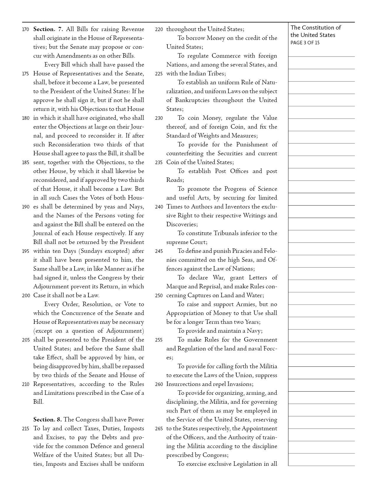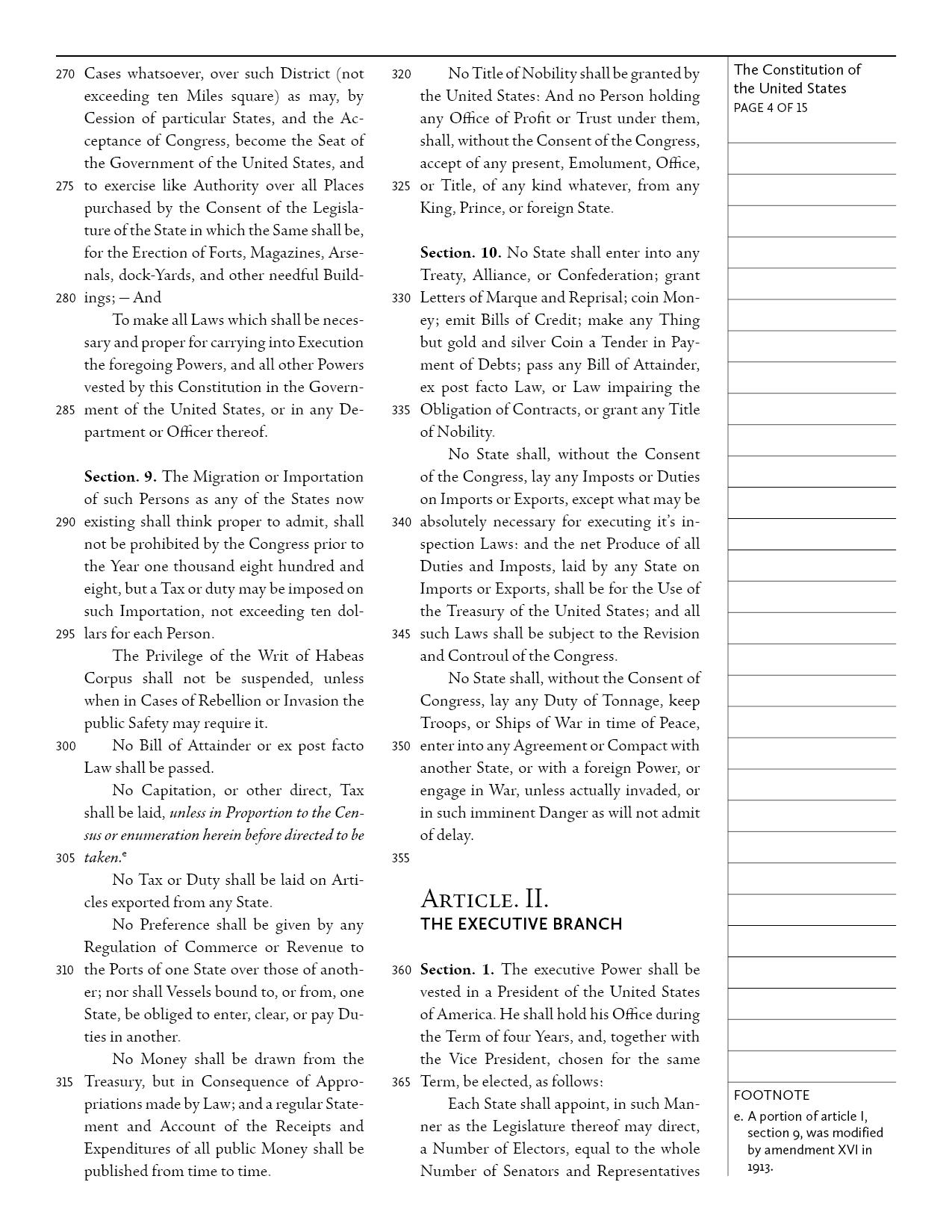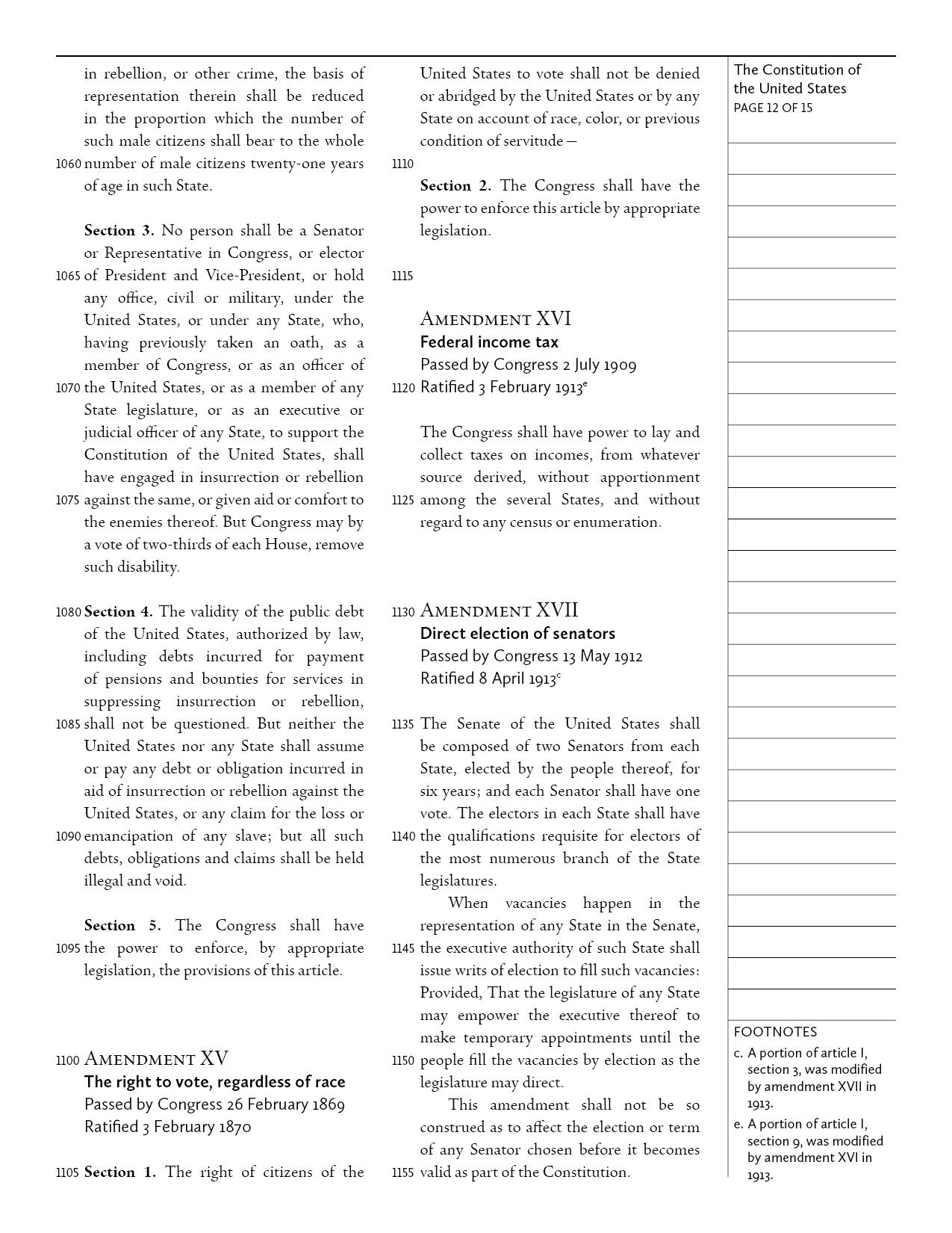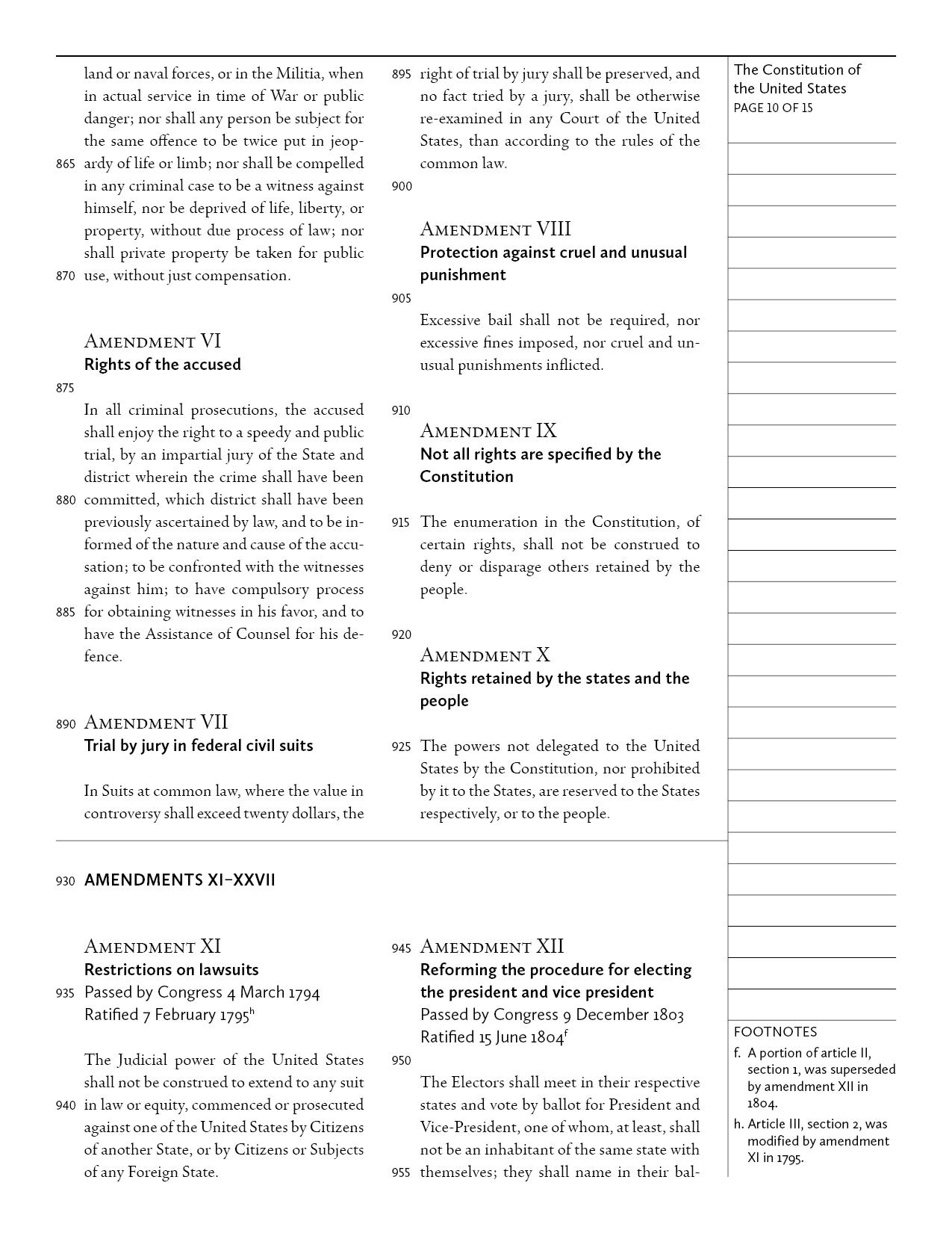 The complete, official text of the Constitution of the United States, including all 27 amendments (the 10 amendments that comprise the Bill of Rights plus the 17 other amendments). The document is divided into two sections so teachers can use which portion they need: the original nine articles, including the names of the signers, are in the first eight pages, so teachers can produce copies of just the original text if they choose; the amendments, including the Bill of Rights, are in the remaining seven pages if the complete document is to be read or studied.