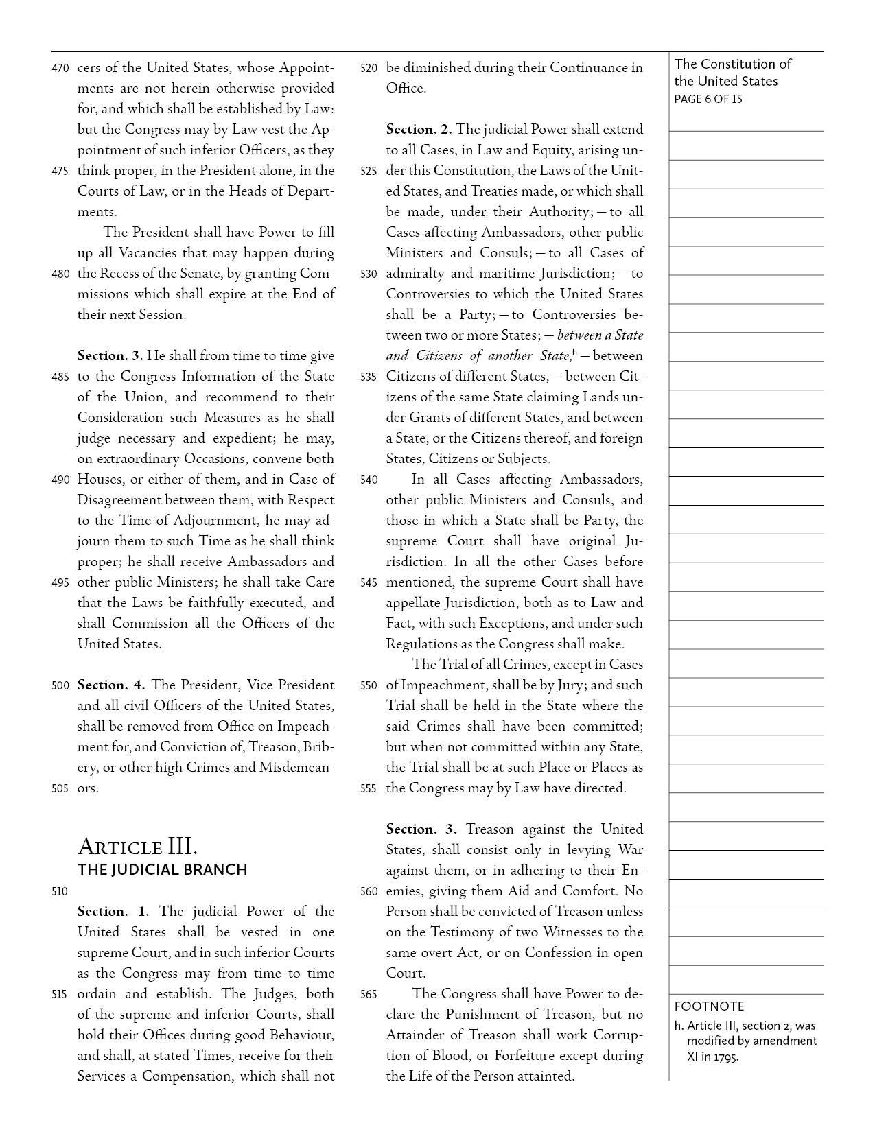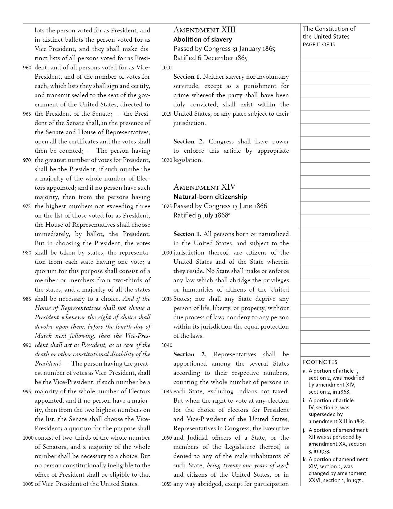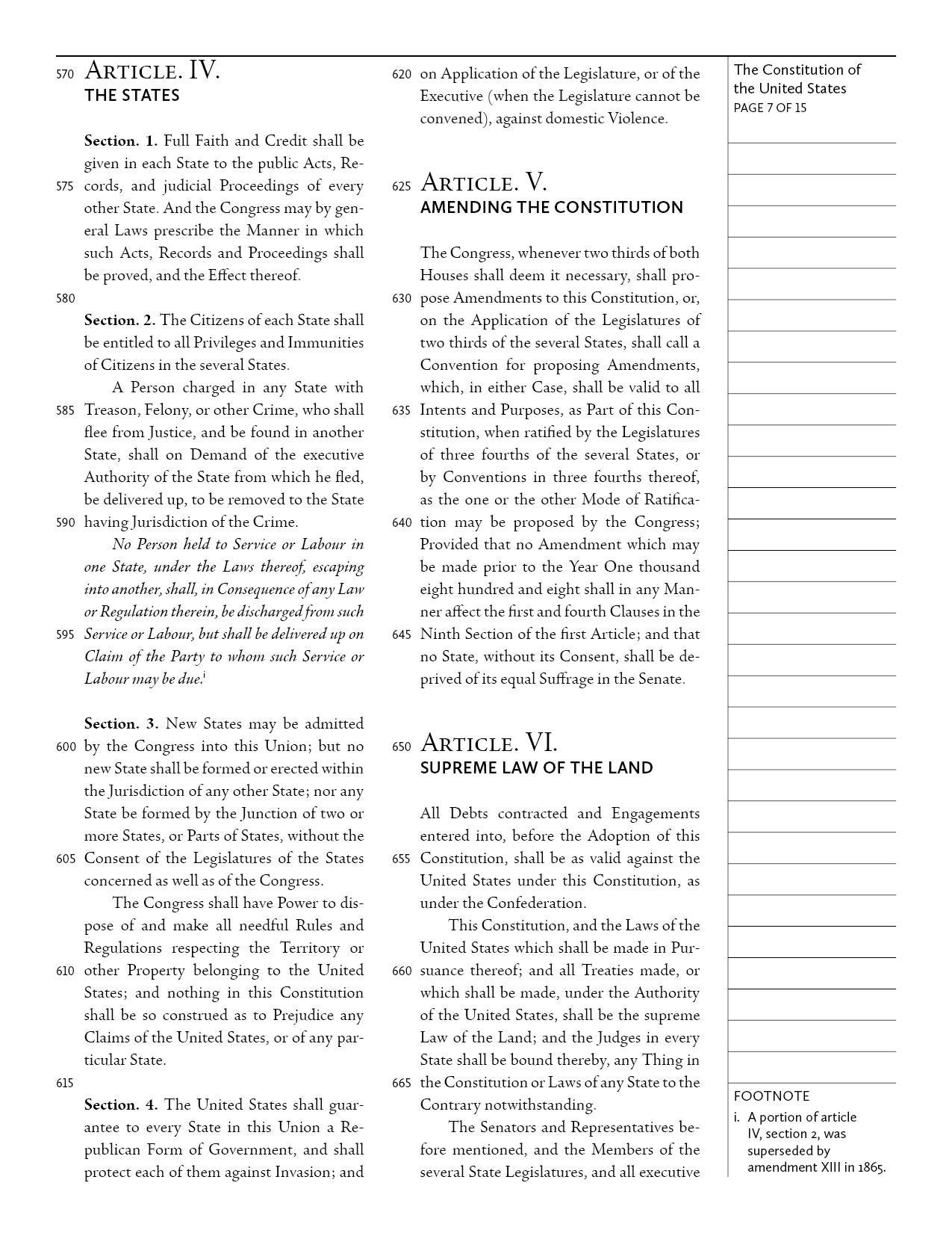 A number of study helps are incorporated into the handout to help students make sense of the document. Superseded, expired, or obsolete portions of text are indicated by italics. Explanatory notes, including the purpose of each of the original nine articles as well as the purpose and approval and ratification dates of each of the amendments, are in sans serif type to distinguish them from the document's official text. Footnotes cross reference the text of the original nine articles with the amendments to show how amendments have changed the Constitution over time.